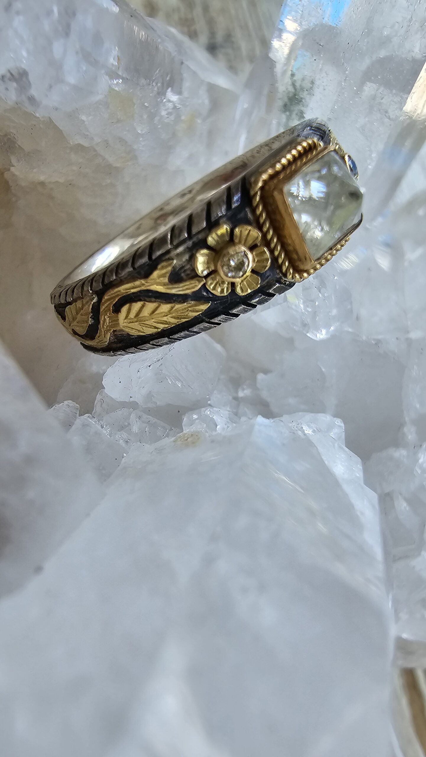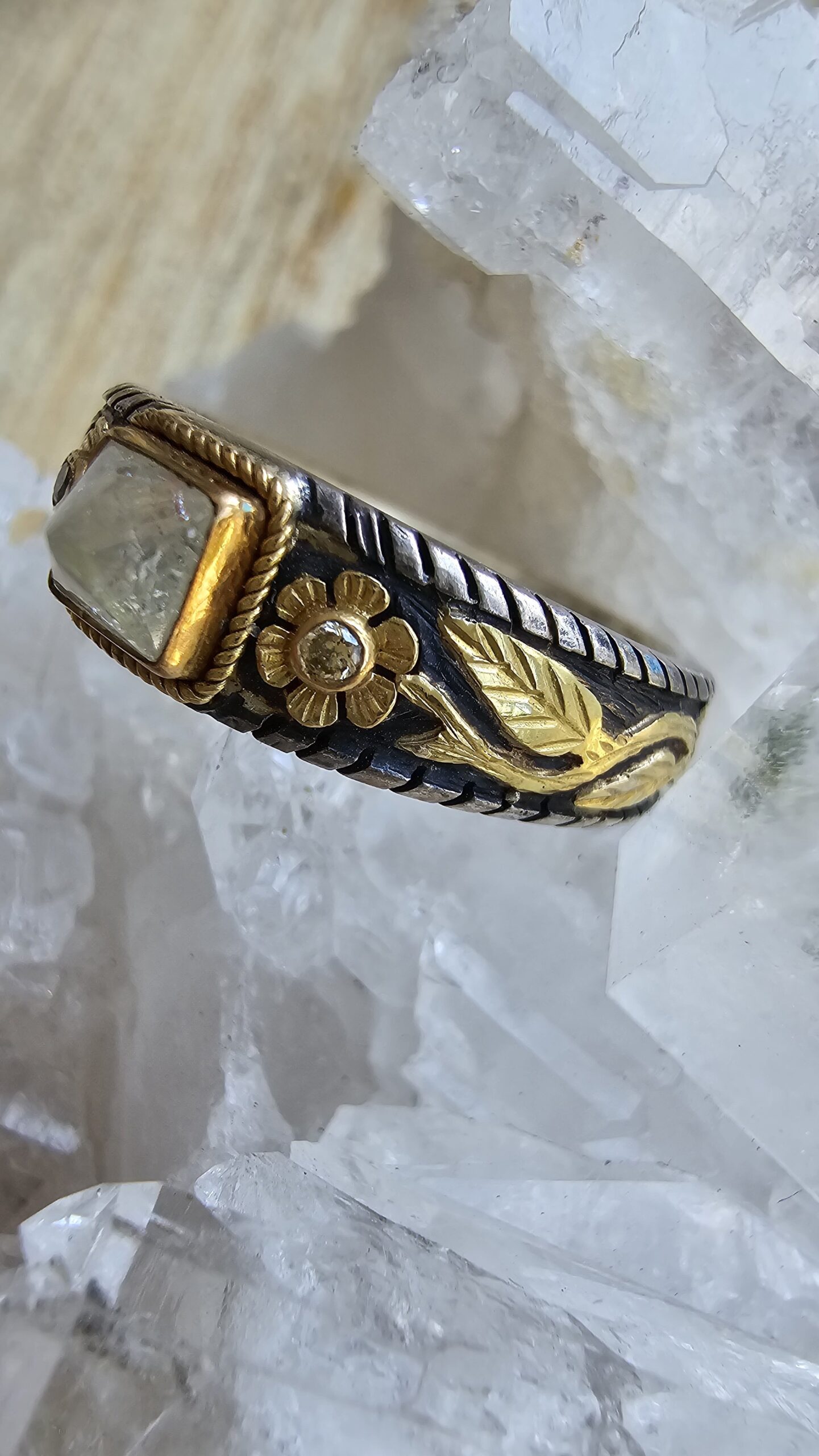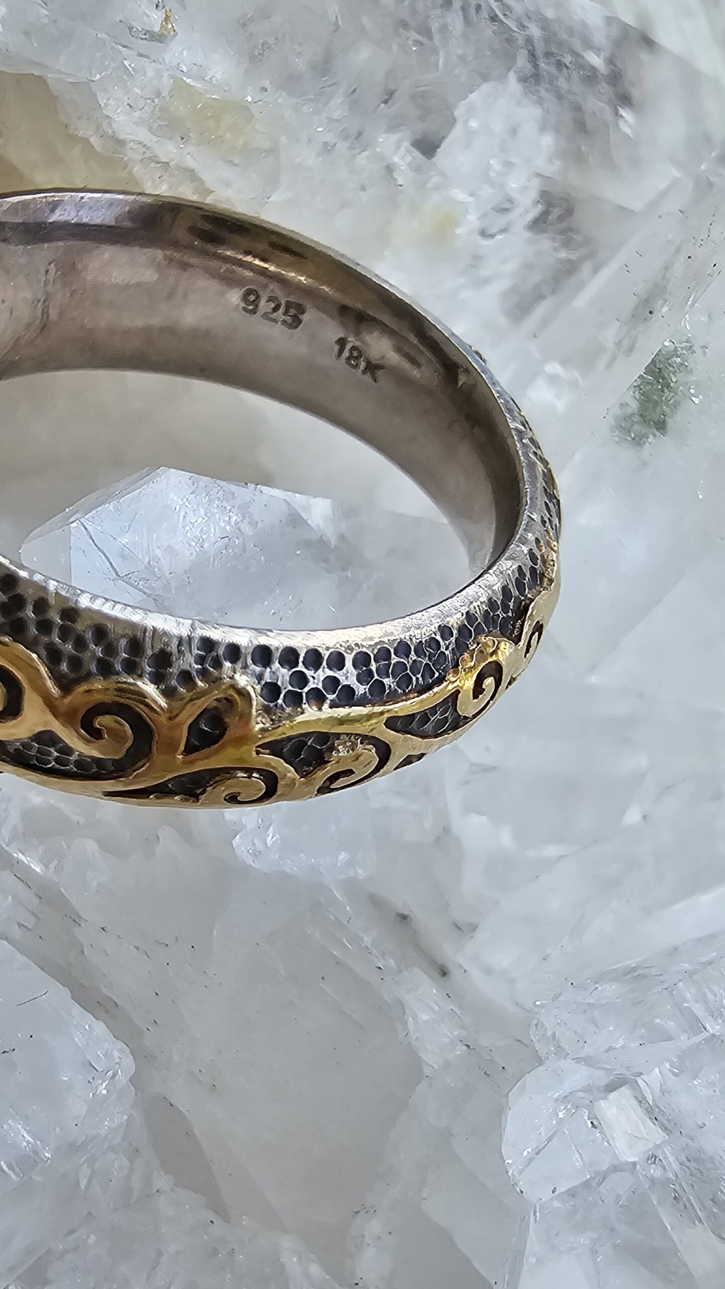El yapımı altın yüzük. Sarı olarak gördüğünüz yerler 18 ayar altın. Geri kalanı gümüş.