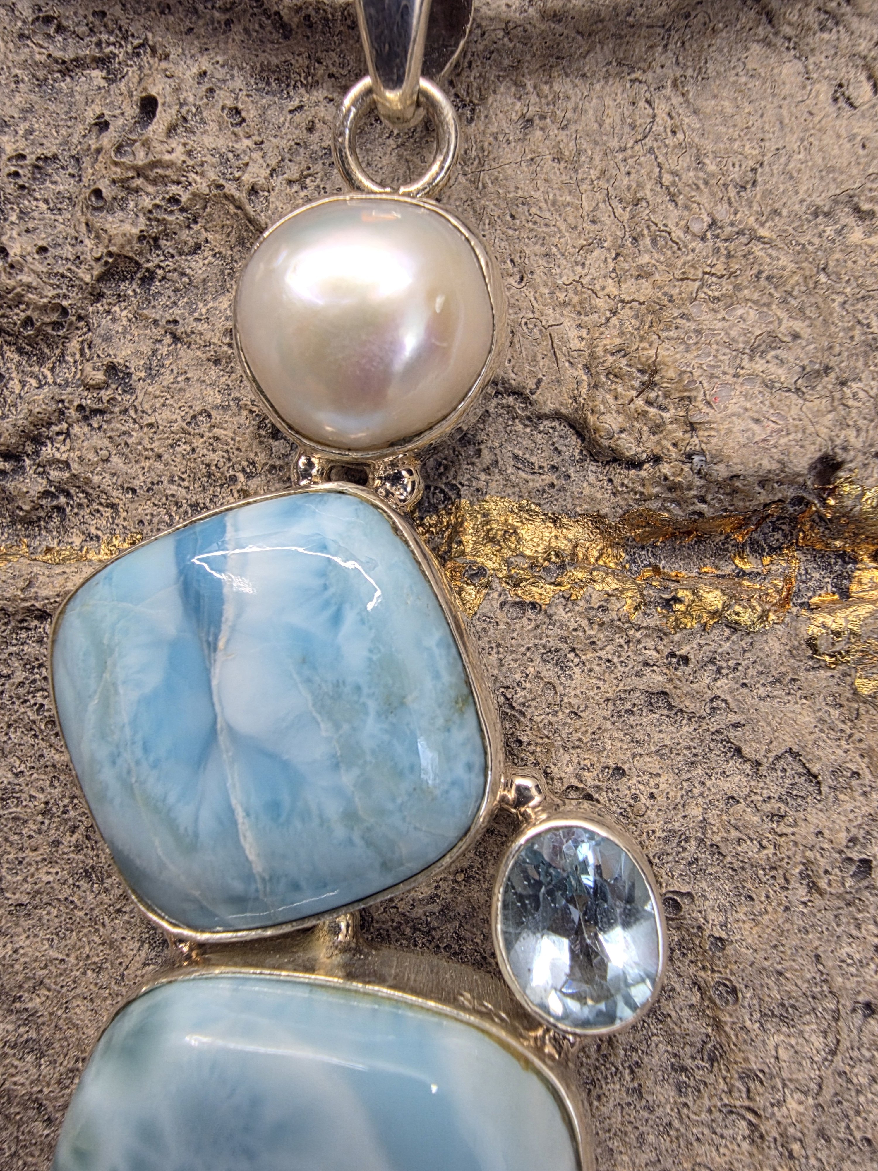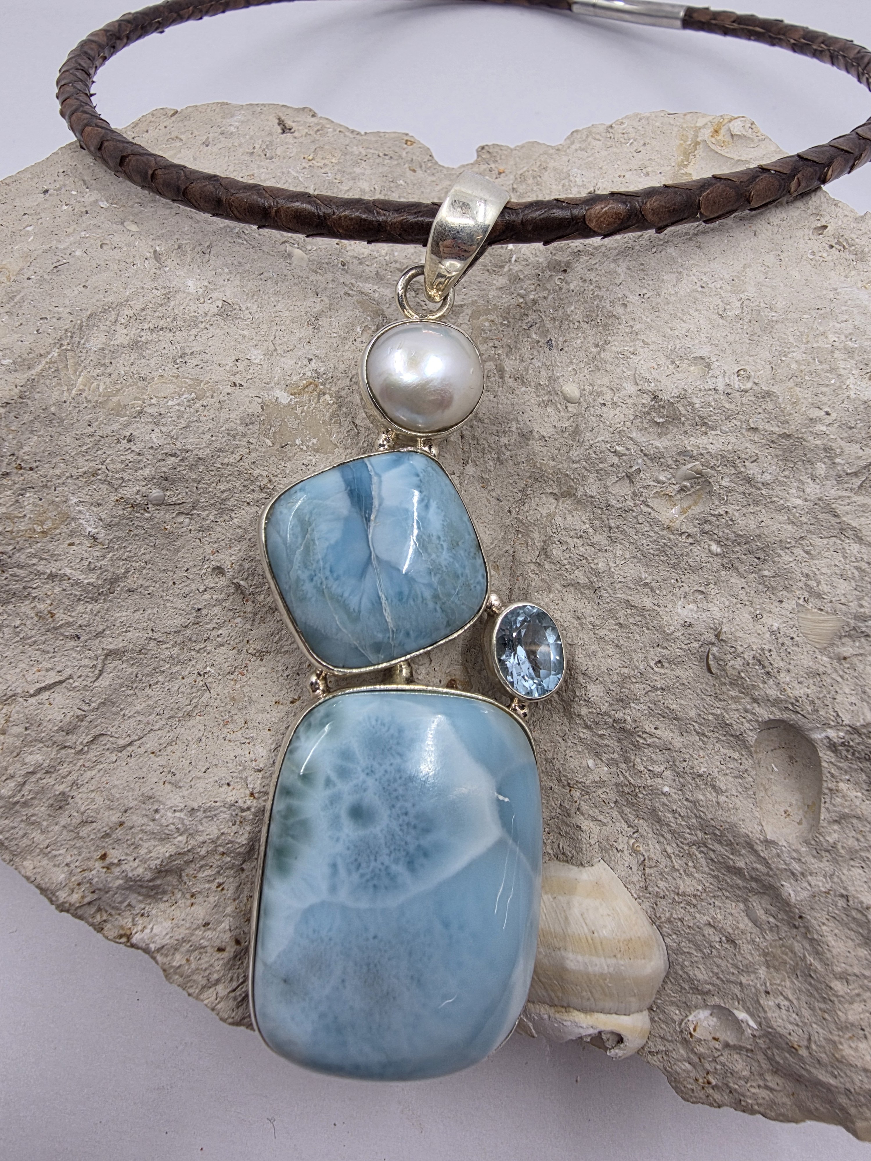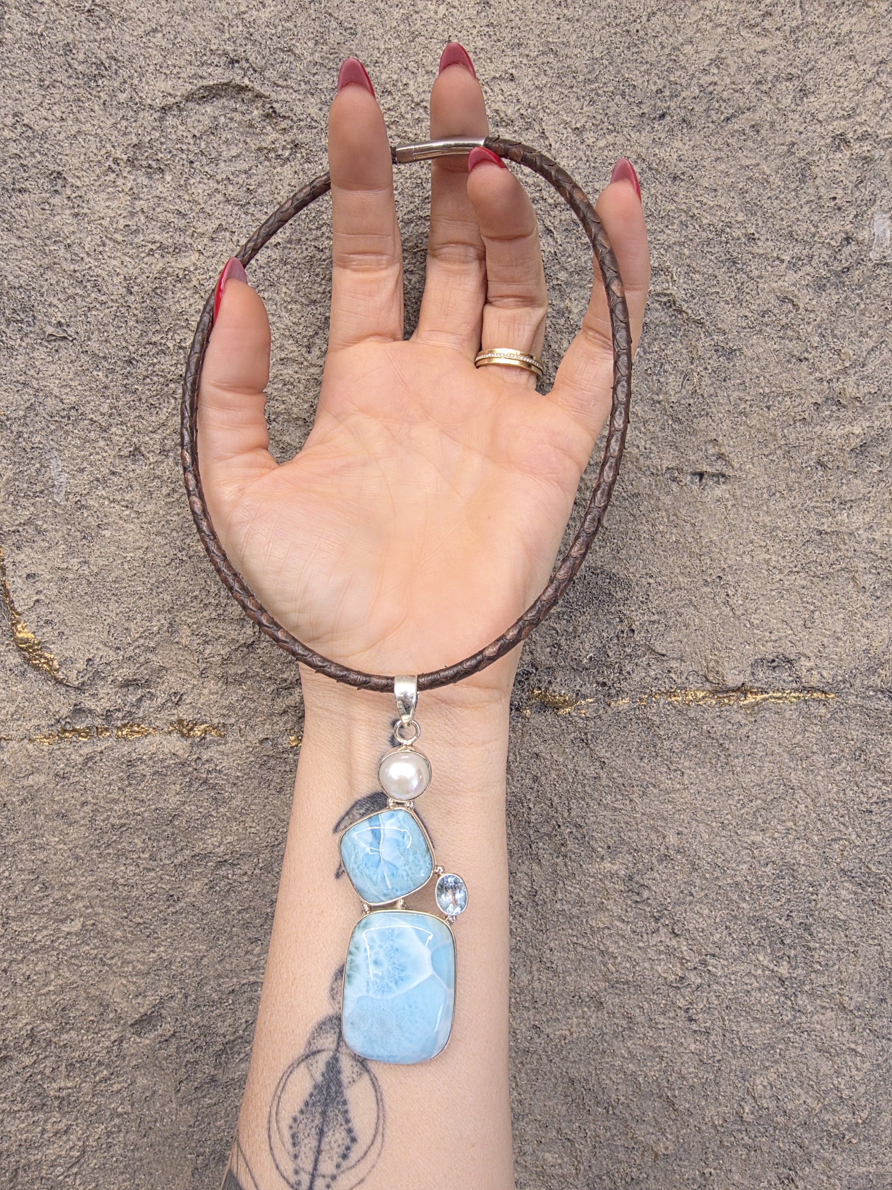 Piton derisi kayışında larimar,inci ve öavi topaz.