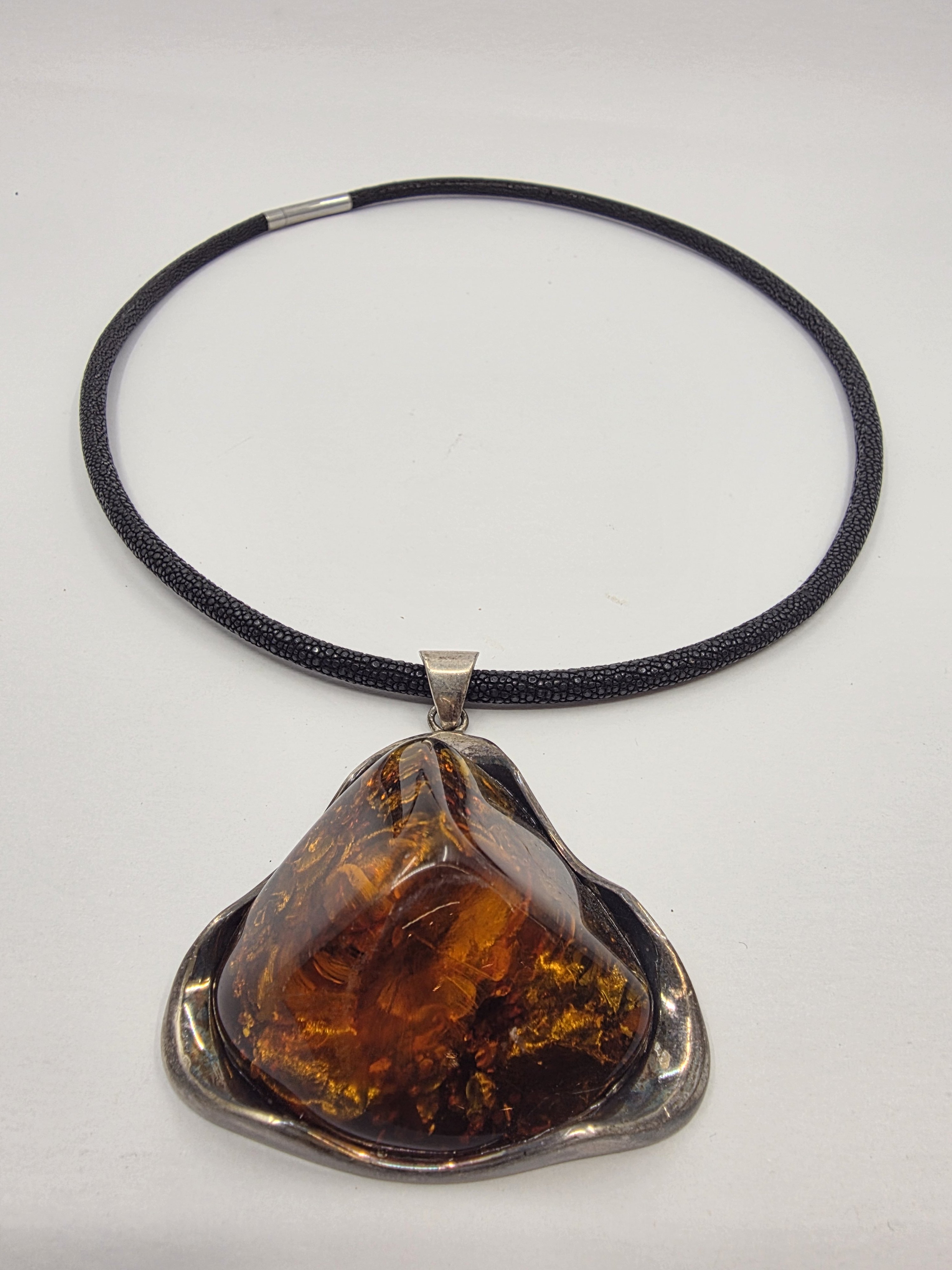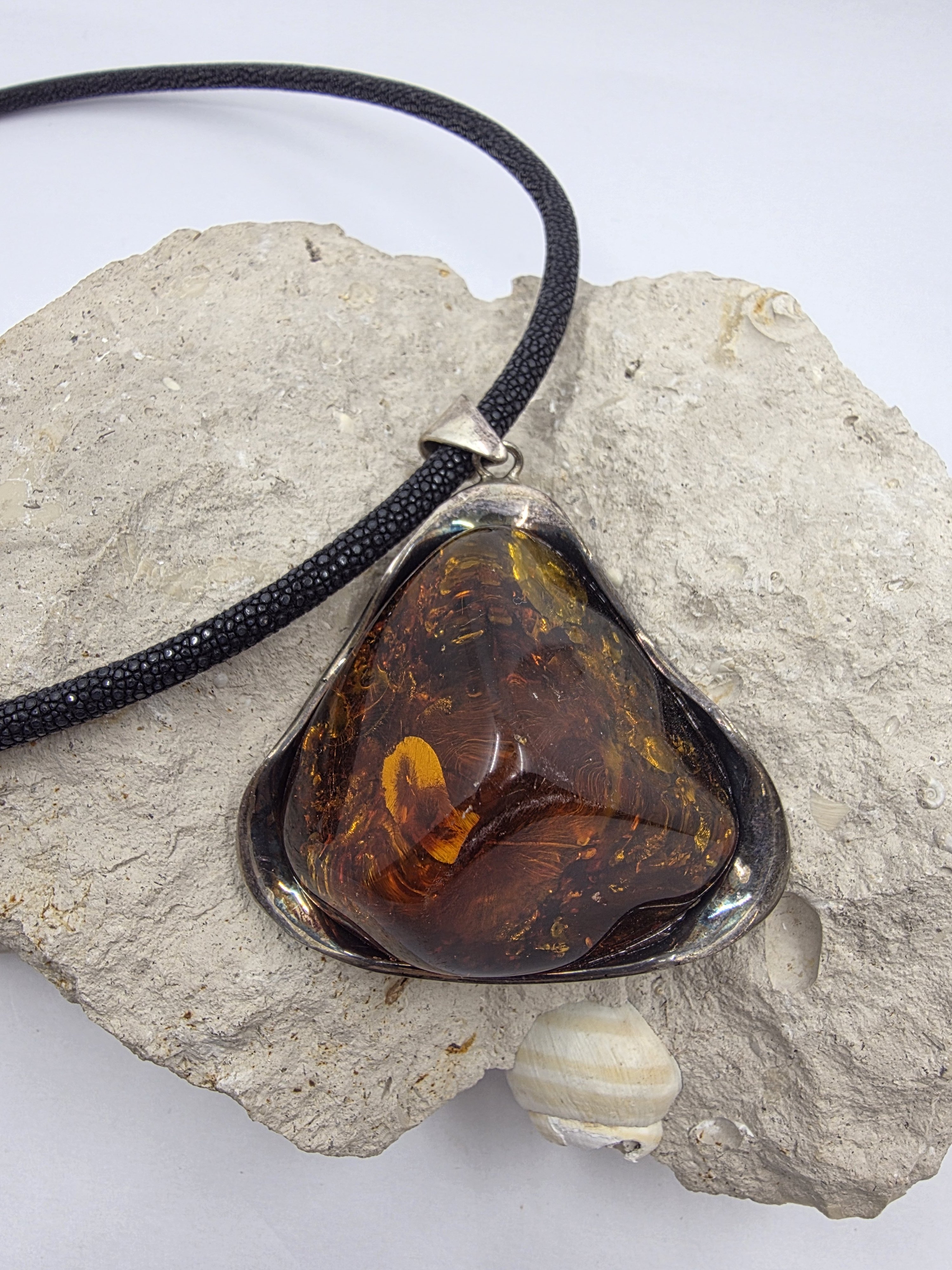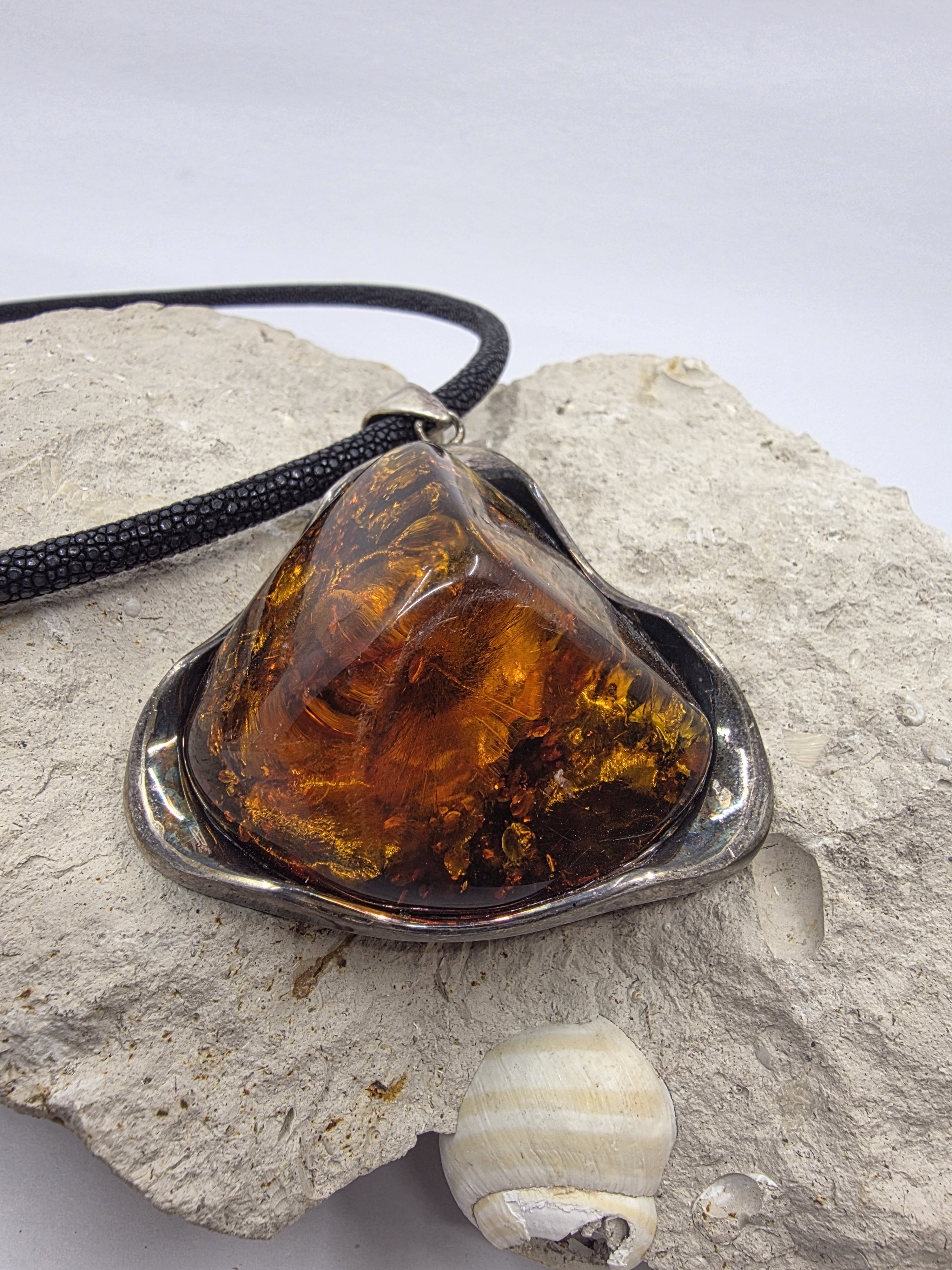 Gümüş döküm çerçevesinde ışıl ışıl şahane bir Polonya kehribarı. Kehribarın içini televizyon gibi izlersiniz. Bugüne kadar çıkardığım en büyük en gösterişli kehribar.