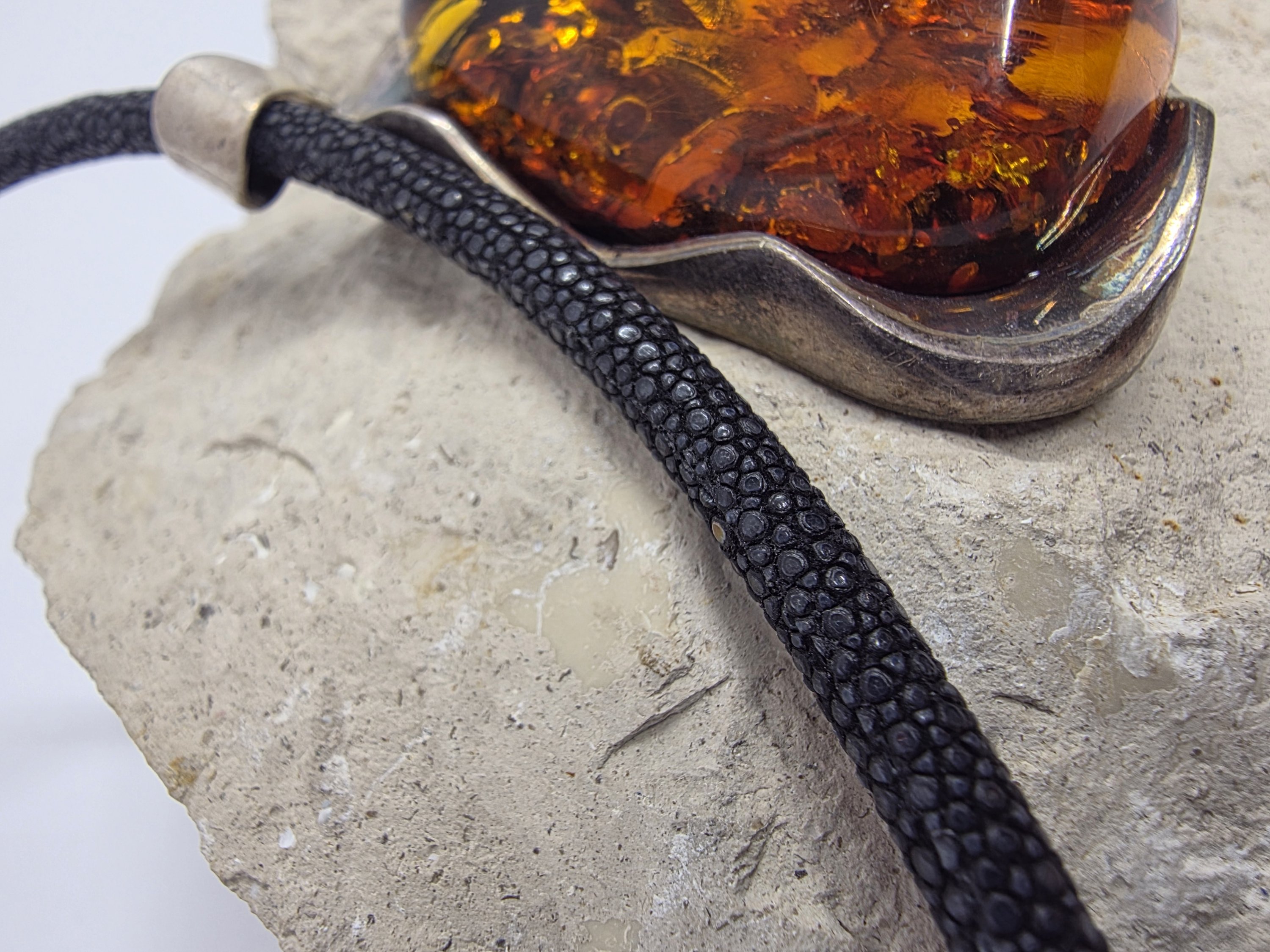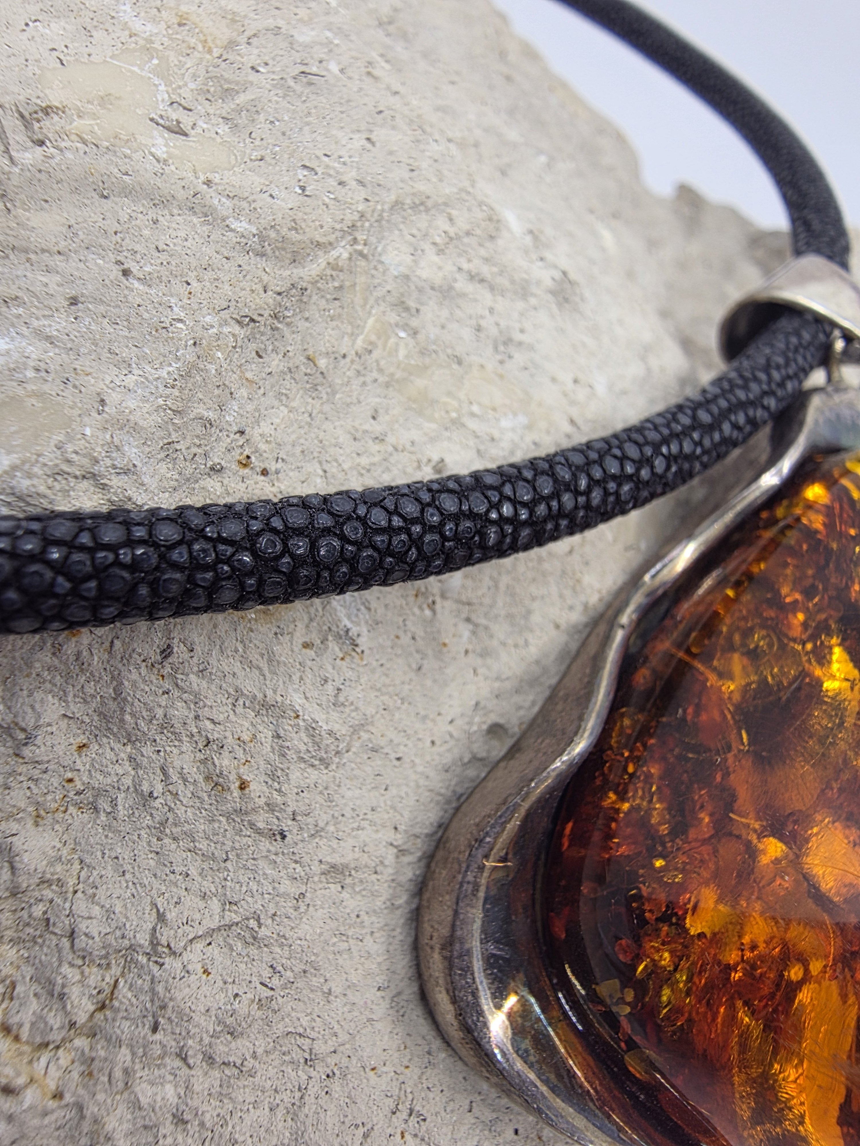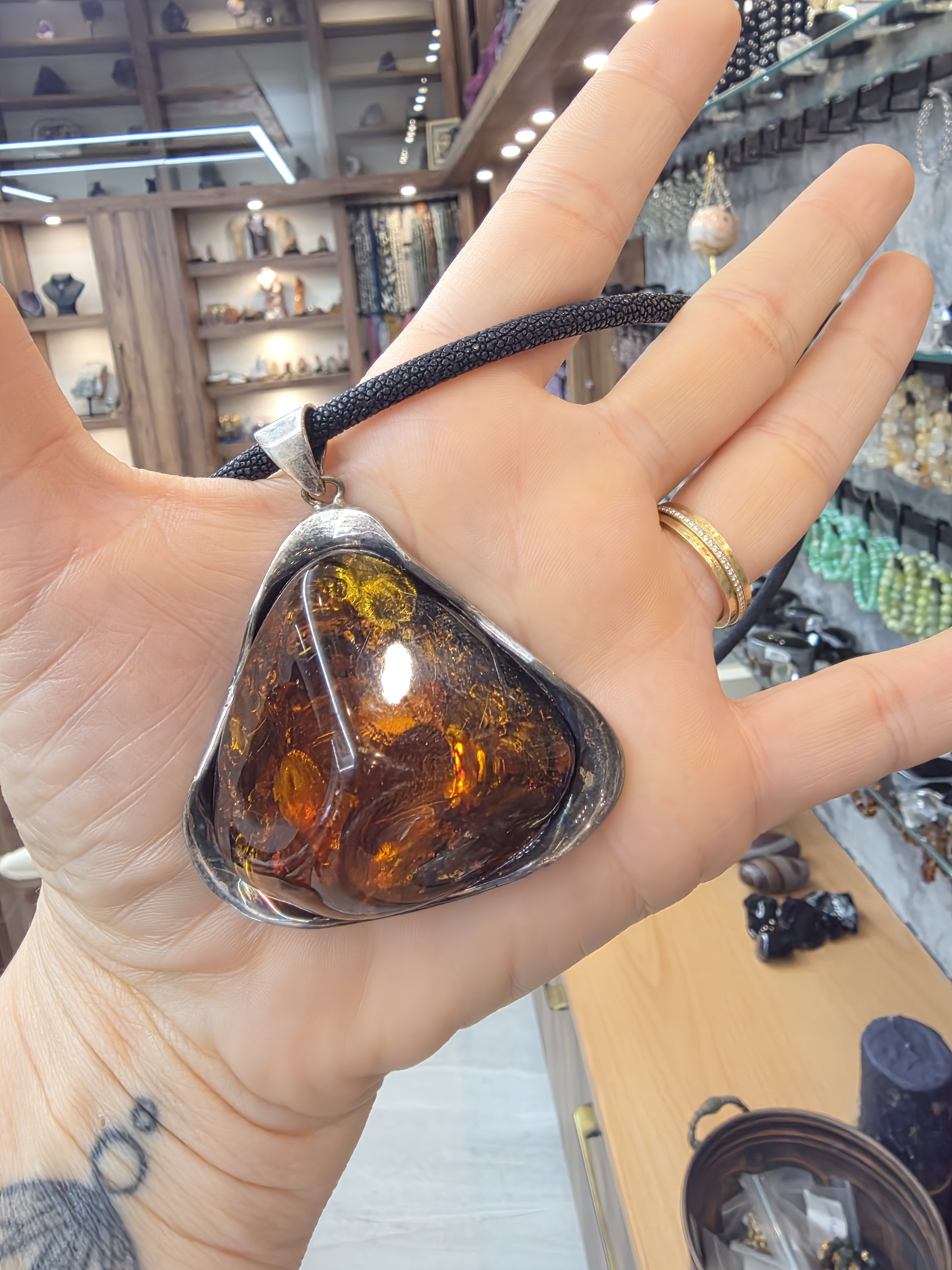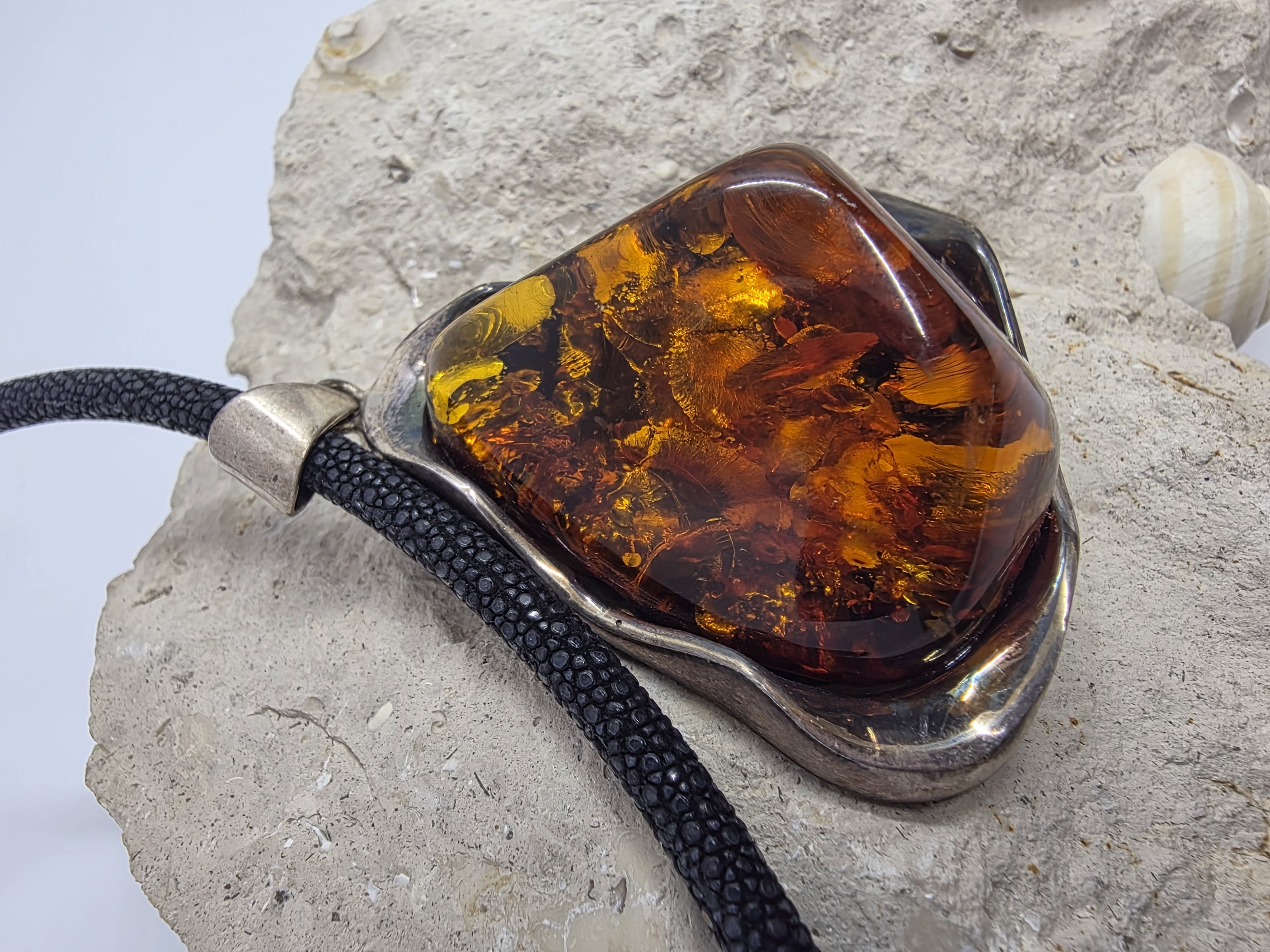 Gümüş döküm çerçevesinde ışıl ışıl şahane bir Polonya kehribarı. Kehribarın içini televizyon gibi izlersiniz. Bugüne kadar çıkardığım en büyük en gösterişli kehribar.